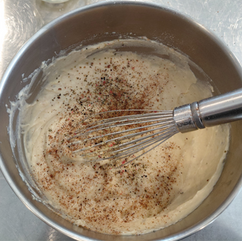 For the bechamel, make a roux by melting the butter and whisking in the flour until it begins to turn a light golden color. Whisk in the milk until smooth and remove from heat. Whisk in the beaten egg yolks until completely combined and stir in the salt, pepper, nutmeg and paprika. Because I was mixing the powdered eggs, I actually added the salt and pepper to that mix and then just added the nutmeg and paprika at the end.