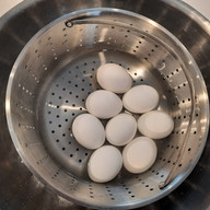 While the eggs are steaming, fill a large bowl with ice and water in which to plunge steamer basket when you remove it.