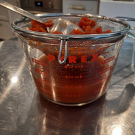Whether using fresh or canned tomatoes, drain them in a mesh strained over a measuring cup