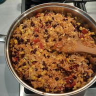 Once the rice is cooked, I add all sorts of stuff including tomatoes black beans, frozen corn kernels, cilantro, diced peppers (hot and sweet), cumin, paprika, lime juice, and depending on my mood -- even a shot of tequila.