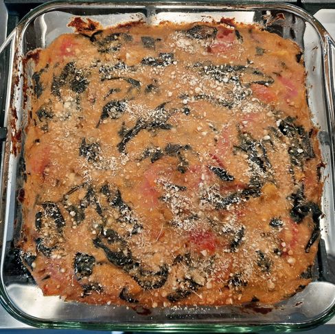 Nana's polenta started with caramelized onions and garlic (of course), then she'd saute frozen or canned spinach in the garlic / onion mix and add beef consomme, canned stewed tomatoes and the cornmeal and stir until the cornmeal was cooked. She would add grated cheese and pepper and spread the mixture into a banking pan and bake it for an hour or so until it was firm enough to cut into squares.